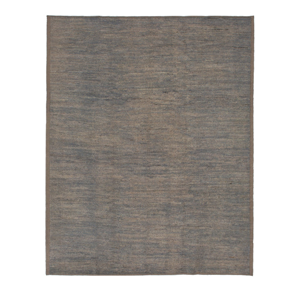 This Blue Zameen Solid Modern Wool Rug offers a combination of traditional craftsmanship and contemporary style. Measuring 9'6" x 11'10", this large transitional area rug features a muted blue color, designed to integrate with various interior aesthetics. The rug is hand-knotted from wool by artisans in Central Asia. This construction method results in a durable and resilient rug, suitable for areas with consistent foot traffic. The natural wool material contributes to its soft texture and inherent strength. Its design presents...