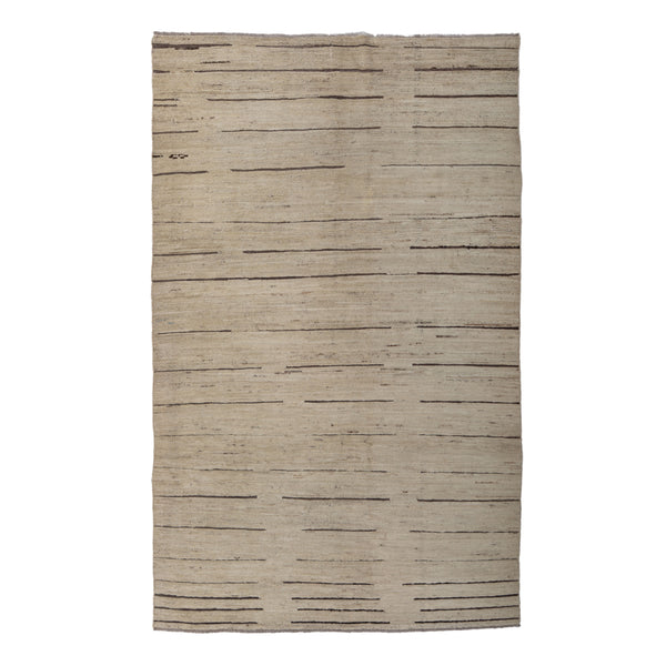 The Natural Zameen Transitional Wool Rug measures 5'6" x 9'1", offering a blend of traditional craftsmanship and contemporary design. This hand-knotted rug is crafted from 100% natural wool, providing both durability and a soft texture underfoot. Its transitional style makes it suitable for various interior decors, from modern minimalist to classic settings. Originating from Central Asia, this rug showcases a unique multicolored pattern. It features a natural, light background color, complemented by irregular horizontal lines in a darker tone, creating...