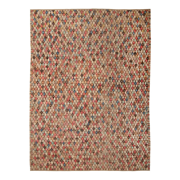 This large Multicolored Zameen Transitional Wool Rug measures 10'0" x 13'8", providing substantial coverage for various interior settings. Hand-knotted in Central Asia, this area rug is made from natural materials, combining traditional craftsmanship with a versatile design. Its surface features a dense, repeating diamond pattern rendered in a diverse, multicolored palette that supports a transitional style. The rug is constructed from wool, a material known for its durability, natural softness, and insulating properties. The hand-knotted technique used in its creation...