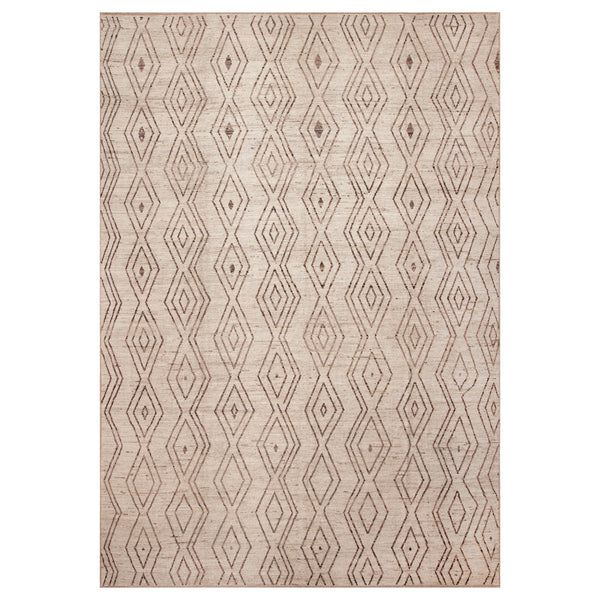 This large area rug features a hand-knotted construction from natural wool fibers. Originating from Central Asia, this piece offers both durability and a distinctive design for various interior spaces. The rug presents a palette of brown tones, featuring a light brown or natural beige base. Darker brown outlines form a repeated diamond pattern, arranged in vertical rows across the surface. Within these outlines, some diamonds are filled with the darker brown shade, creating a geometric motif that adds visual interest....