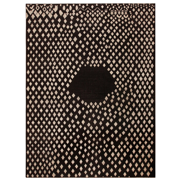 This large Black Zameen Transitional Wool Rug measures 12'7" x 16'8". It features a black background patterned with a repeating grid of small, off-white diamond shapes. A solid black diamond provides a central accent, creating a visual focal point within the geometric design. Additional abstract patterns in off-white detail the rug's top border. Crafted from natural wool, this rug is hand-knotted using traditional methods. Its construction originates from Central Asia, ensuring a durable and dense textile. The rug's transitional style...