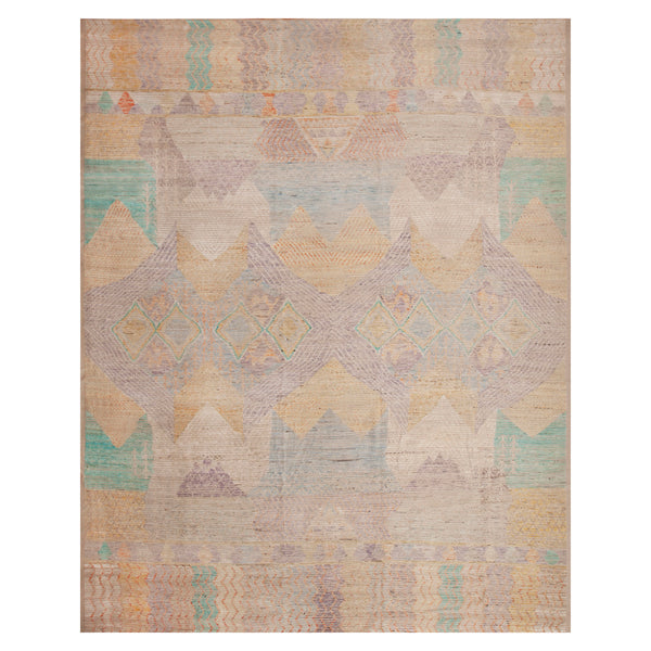This Multicolored Zameen Transitional Wool Rug measures 13 feet by 15 feet 10 inches, providing a substantial area rug for large spaces. Hand-knotted from wool, this floor covering originates from Central Asia, showcasing traditional craftsmanship with a contemporary design. The rug features an abstract geometric pattern executed in a muted pastel color palette. Shades of light blue, lavender, soft beige, pale yellow, and hints of muted green and peach blend across the surface. The design incorporates subtle zigzags, faded diamond...
