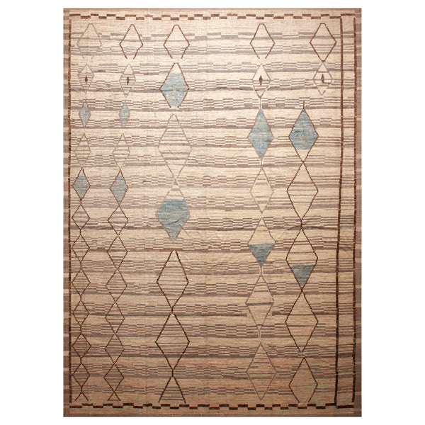 This hand-knotted wool rug from the Zameen collection offers a blend of traditional craftsmanship and contemporary design. Originating from Central Asia, this rug measures 13'7" x 18'6", making it suitable for large living rooms, dining areas, or open-plan spaces. The design features a natural color palette. The field of the rug is primarily a light, earthy brown and beige, accented with subtle horizontal stripes in darker brown tones. A series of interconnected diamond motifs are outlined across the surface in...