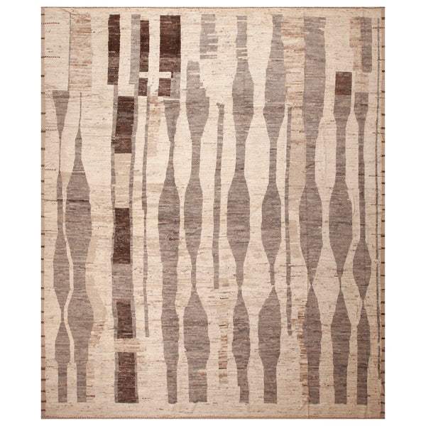 This Brown Zameen Transitional Wool Rug is a stunning 14' x 16'8" piece from Central Asia. Hand knotted from quality wool, this rug features an abstract pattern in shades of brown, beige, and cream. The combination of solid and textured lines creates a modern and sophisticated design with depth and movement. A beautiful addition to any space.