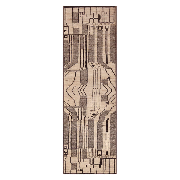 The Black Zameen Transitional Wool Runner, measuring 3' x 9'8", offers a modern design created through traditional hand-knotting techniques. This runner features a detailed abstract geometric pattern in black, set against a natural, undyed wool ground. Constructed from 100% wool, this runner provides both resilience and a pleasant texture underfoot. The natural properties of wool contribute to its durability, making it suitable for areas with regular foot traffic. Each piece is hand-knotted, a method originating from Central Asia, showcasing skilled...