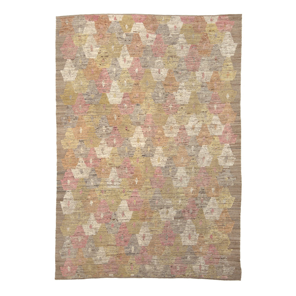 This Zameen Transitional Wool Rug offers a blend of natural materials and expert craftsmanship. Hand-knotted from durable wool, this area rug originates from Central Asia, reflecting traditional rug-making techniques adapted for modern interiors. The rug features a multicolored pattern, presenting an array of soft hues including various shades of pink, yellow, grey, off-white, and subtle orange or peach tones. These colors form a repeating geometric design, with shapes that resemble stylized hexagons or diamonds, set against a muted, natural beige...