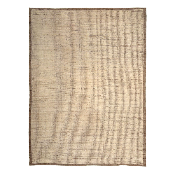 This Brown Zameen Transitional Wool Rug is a Central Asian hand-knotted masterpiece. This 9' x 11'10" rug features a simple, beige color with a subtle textured pattern and a darker brown border. The high-quality wool material adds a touch of luxury to any room.