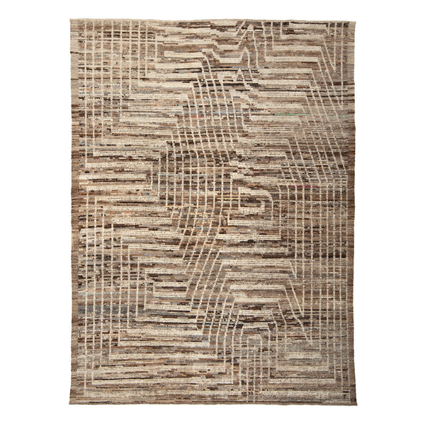 This Zameen rug is a hand-knotted wool piece, designed to introduce a transitional aesthetic to various interior spaces. Measuring 9'1" x 11'9", it provides significant floor coverage. The rug features a brown color scheme, built from varying natural shades that create a textured, horizontal base. Overlaid on this foundation is a distinct geometric pattern, rendered in lighter contrasting tones. This pattern forms an abstract, grid-like design with both angular and curving lines, which contributes to the rug's transitional style, blending...