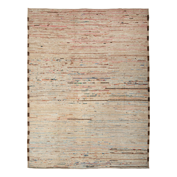 This Multicolored Zameen Transitional Wool Rug, measuring 9'4" x 11'10", offers a blend of natural appeal and versatile design. Crafted from high-quality wool, this large area rug is hand-knotted by artisans in Central Asia, ensuring durability and unique character. The rug's design features a light, neutral base color, upon which subtle horizontal lines of various hues are integrated. These multicolored strands introduce depth and visual interest without overwhelming a space. The color palette includes muted tones of reds, blues, browns,...