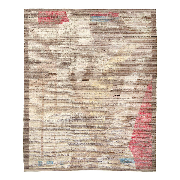 This Brown Zameen Transitional Wool Rug measures 9'5" x 10'11", making it a significant addition to various interior spaces. It is a hand-knotted piece crafted from natural wool, with its origin tracing back to Central Asia, a region recognized for its traditional textile artistry. The rug features a natural brown and beige base, characterized by subtle horizontal variations in tone that create a textured visual effect. Its design incorporates abstract elements, including distinct blocks of muted red, soft blue, and...