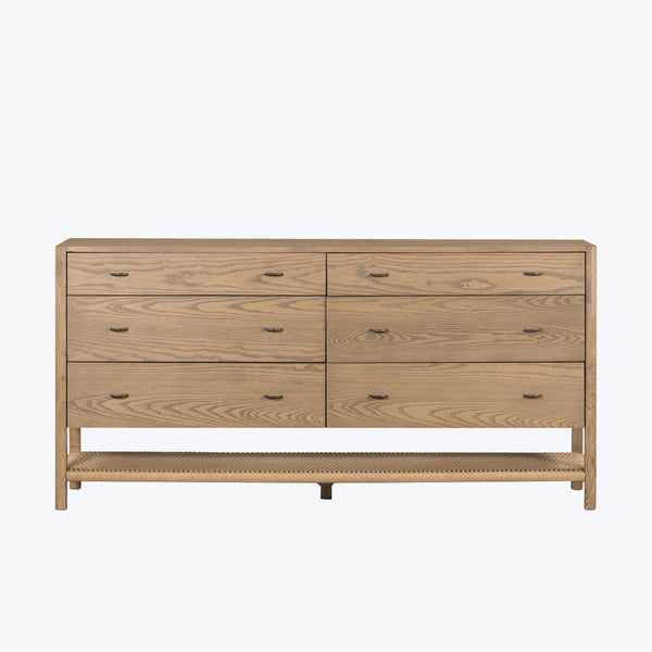 Simple and refined, the Zuma 6-Drawer Dresser by Four Hands is designed in the Scandinavian tradition. This elegant piece is crafted in solid ash and detailed with gunmetal-finished iron hardware. In true Danish style, the Zuma 6-Drawer Dresser features stretcher-style shelving in woven paper cord. Six spacious drawers offer ample storage.