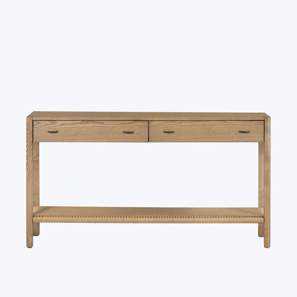 A celebration of Scandinavian simplicity, the Zuma Console brings Danish-inspired design to cool, contemporary interiors. This refined console is crafted in solid ash and features dual drawers and open woven paper cord shelving.